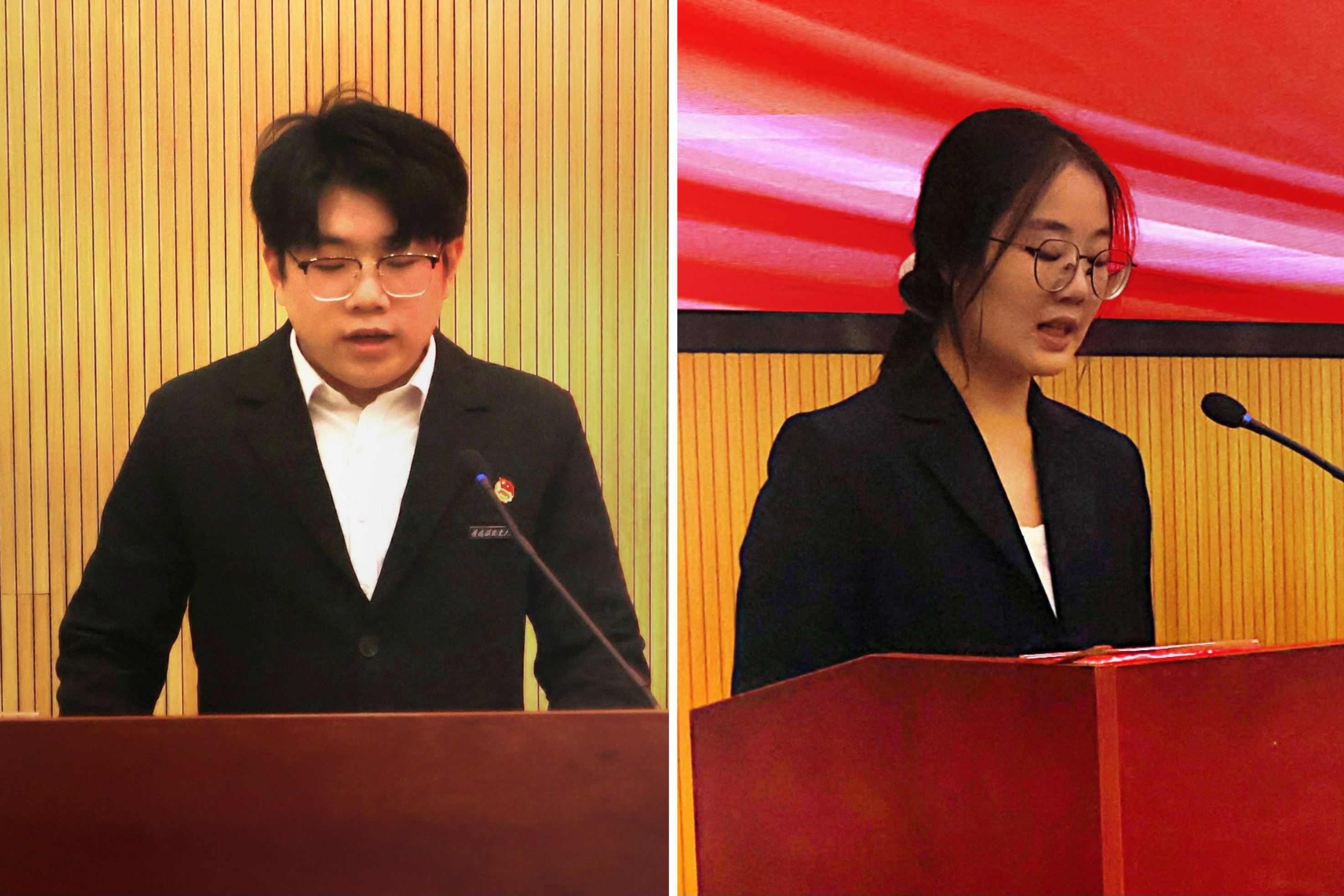2023级思想政治教育专业硕士刘星洋同学,2022级环境工程专业张欣瑶同学作为优秀学员代表发言。